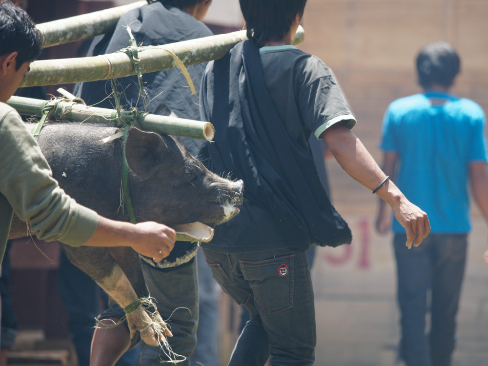 Die Gäste bringen unter anderem Schweine mit, die vor den Festzelten ausgelegt werden. Die festlich gekleideten Angehörigen begrüßen die Gäste und begutachten die Geschenke. Es ist üblich, dass Geschenke wie z.B. Schweine versteigert werden, um so einen Teil der hohen Kosten eines solchen Festes wieder hereinzuholen.