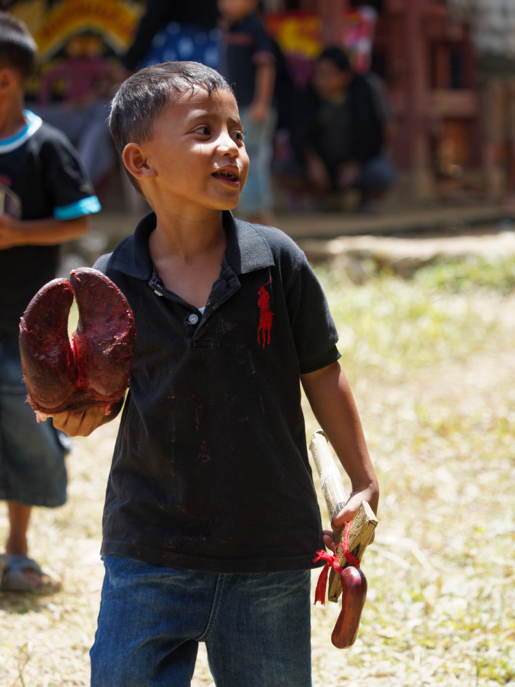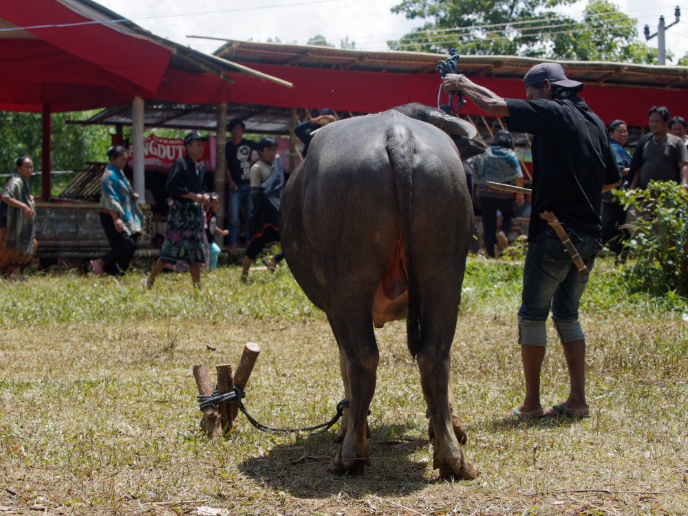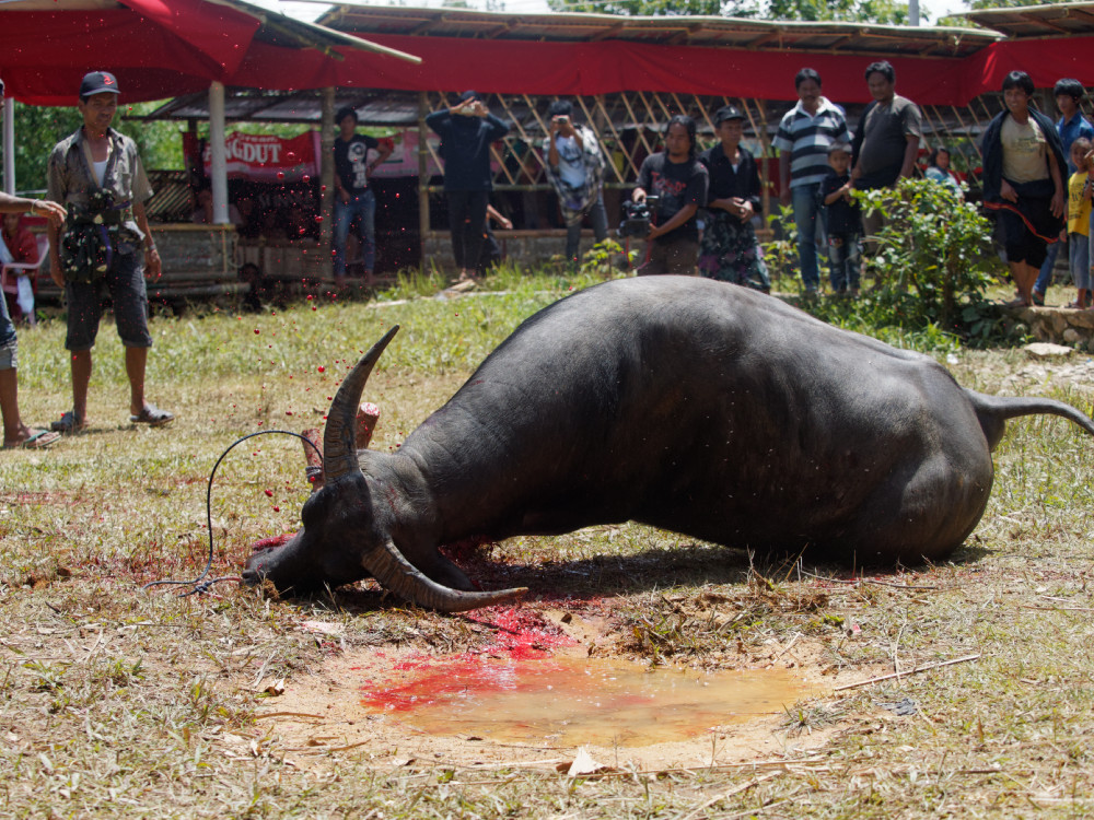 Solche Begräbnisfeiern dauern mehrere Tage. Wir waren anwesend, als die Gäste mit Geschenken eintrafen und später ein Wasserbüffel geopfert wurde. Es war nur eine kleine Totenfeier, deshalb wurde nur ein Büffel geopfert. Auf großen Festen sind es durchaus mehrere. Das Fleisch der geopferten Tiere wird später gebraten und an die Gäste verteilt.