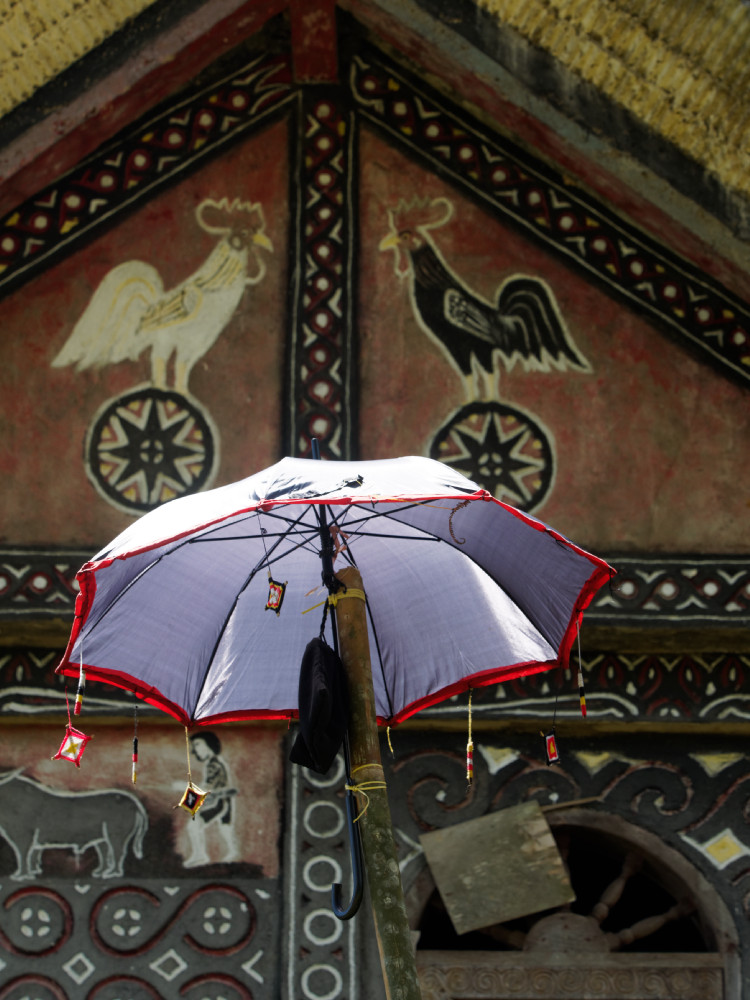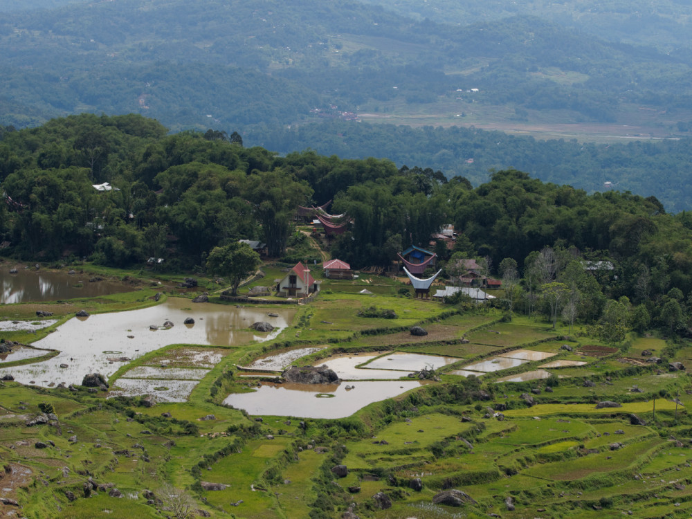 Batutumonga liegt auf fast 2.000 m Höhe inmittel von Hügeln mit Reisfeldern. Der Blick reicht bis Rantepao und auf die hohen Berge des Toraya-Landes. Verstreut in der Landschaft sieht man Toraya-Dörfer mit den typischen Tongkonan-Dächern.